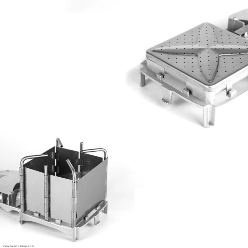 این اجاق با بدنهای از استیل ضدزنگ و آلیاژ آلومینیوم ساخته شده که مقاومت بالایی در برابر حرارت و ضربه دارد. طراحی مشبک با سوراخهای هوای متقارن، توزیع یکنواخت گرما و ایجاد شعله قوی را ممکن میسازد. سیستم اتصال Snap-on امکان مونتاژ و دمونتاژ سریع را بدون نیاز به هیچ ابزاری فراهم میکند.