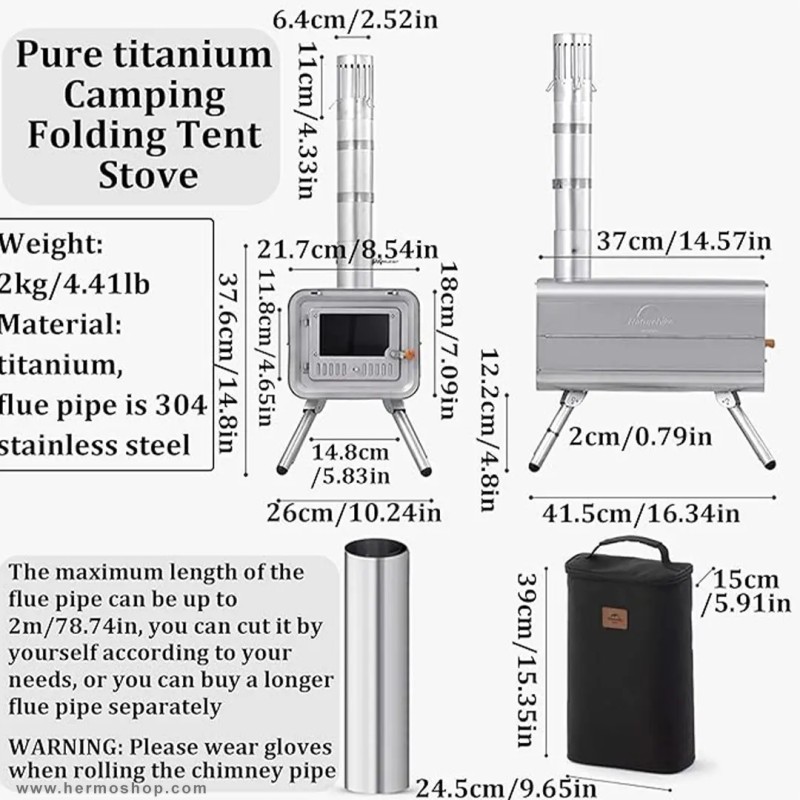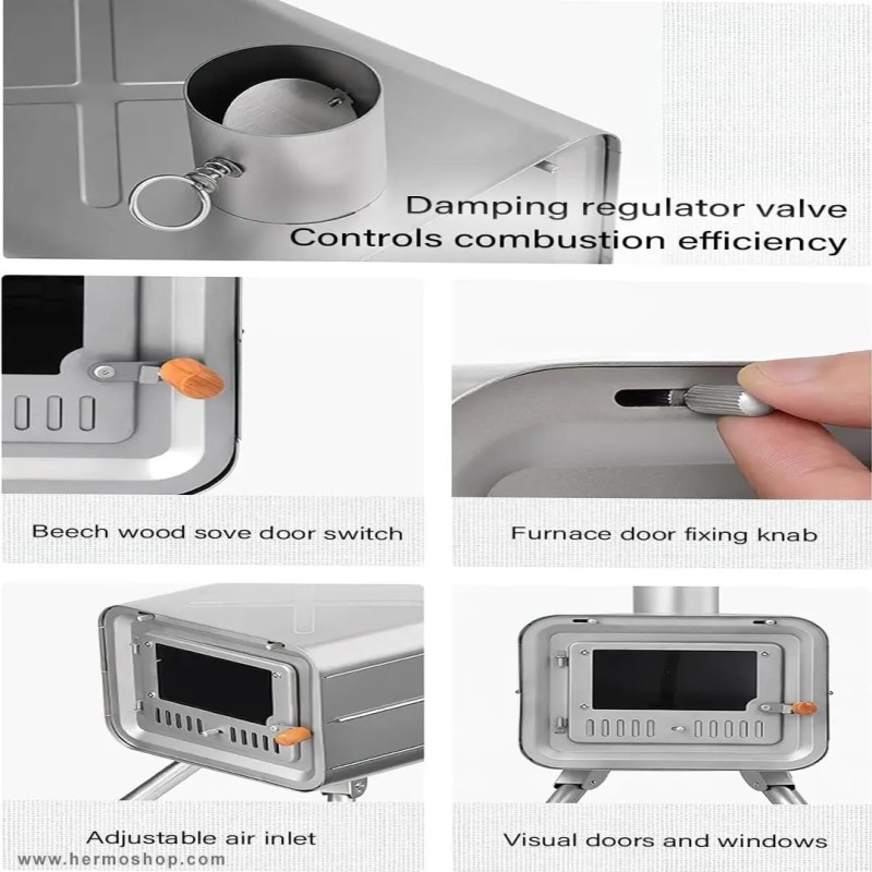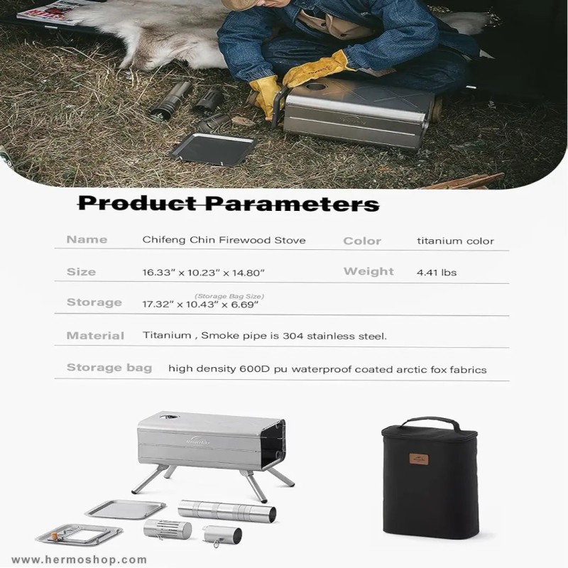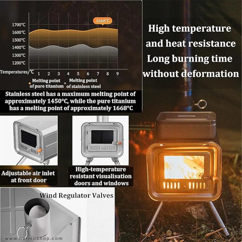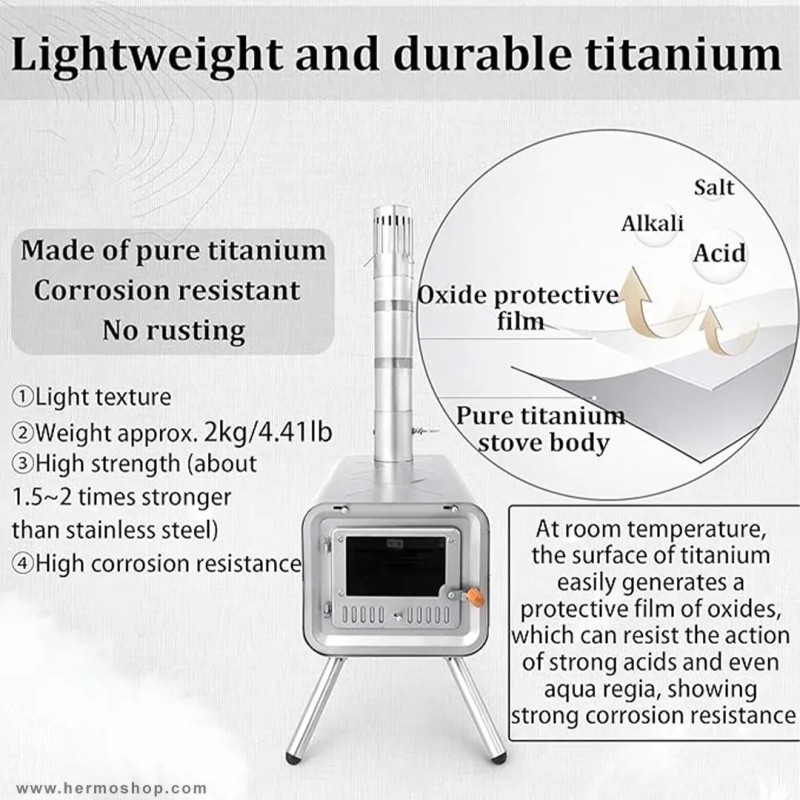 این بخاری از تیتانیوم خالص ساخته شده که در برابر خوردگی، اسید و حرارت بالا مقاومت استثنایی دارد. طراحی مستطیلی با درب جلوئی برای قرارگیری هیزم و سیستم دودکش مجهز، عملکرد بهینه را تضمین میکند. ساختار تاشو امکان حمل و نقل راحت را فراهم مینماید.
