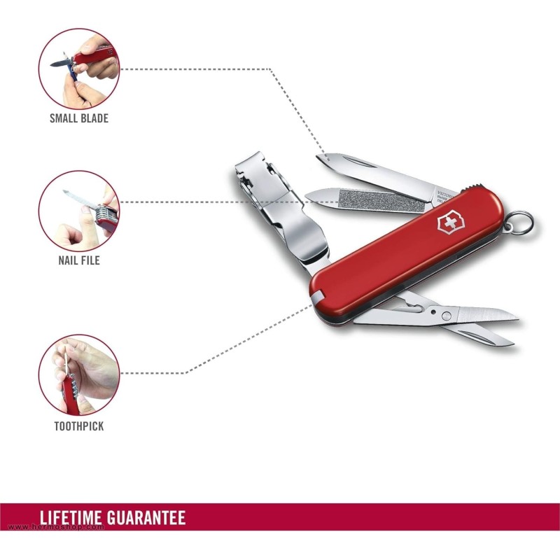 دارای: تیغه، کوچک، قیچی لبه دندانه دار، سوهان ناخن، پاک کننده ناخن، ناخن گیر، حلقه کلید، موچین، خلال دندان، سوهان ناخن