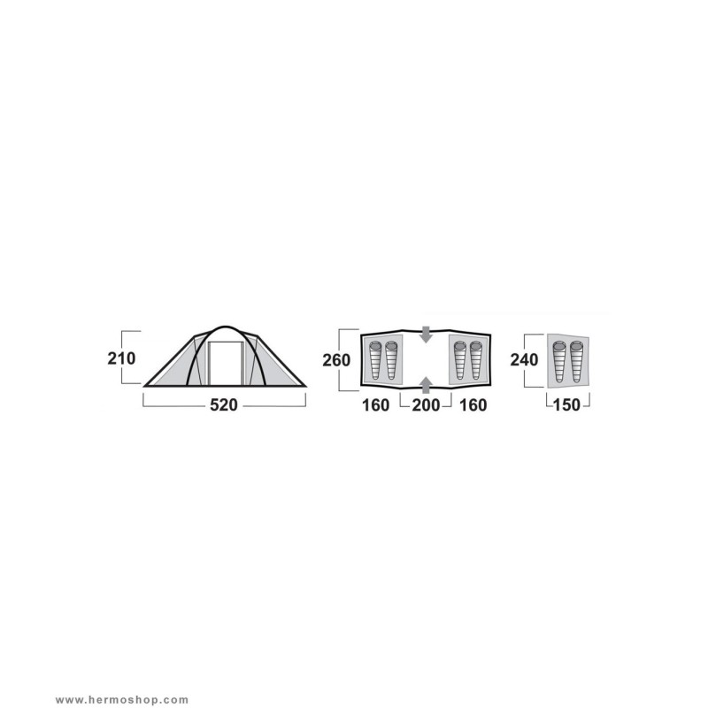 - ابعاد اتاق چادر: دارای دو عدد اتاق مجزا از هم که هر یک دارای ابعاد 160 * 260 سانتی متر با ارتفاع 210 سانتی متر می باشد