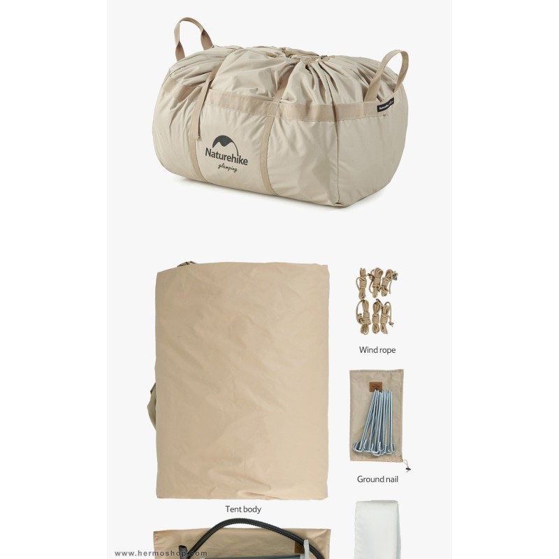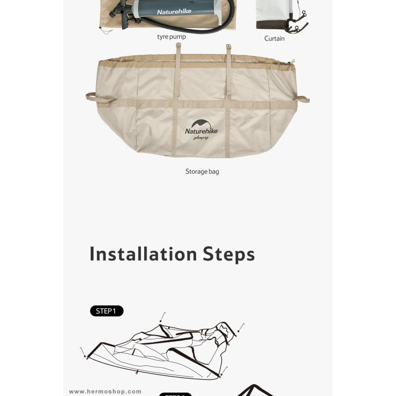 شامل 16 میخ فلزی، 6 طناب، پمپ باد، پرده، کیسه حمل