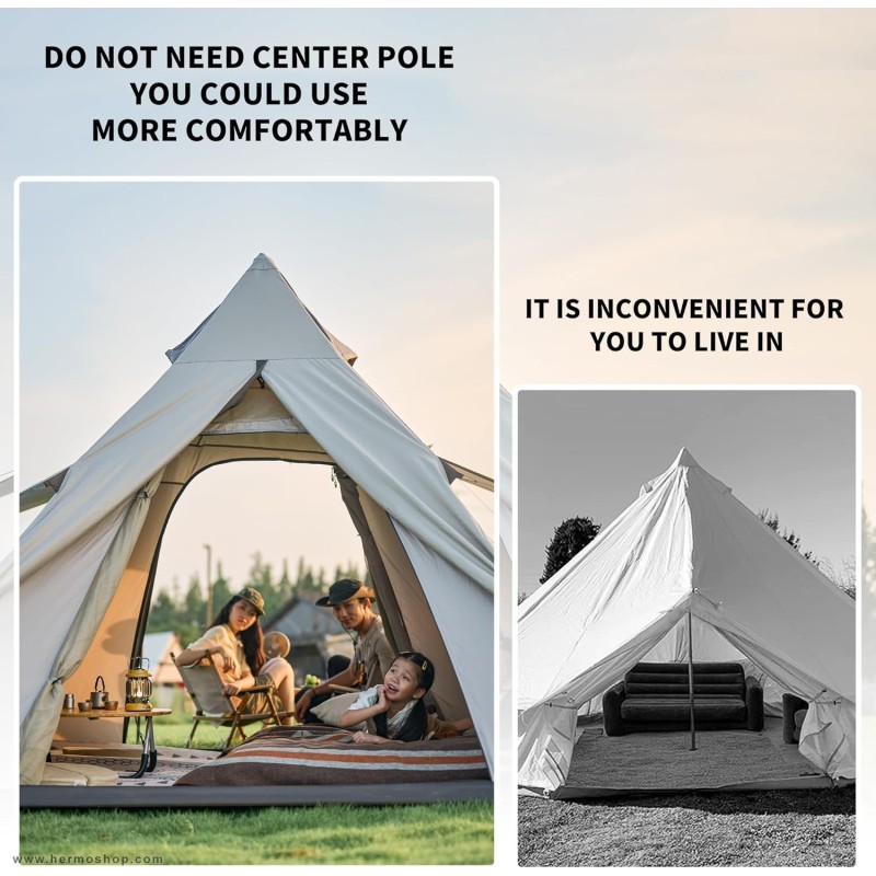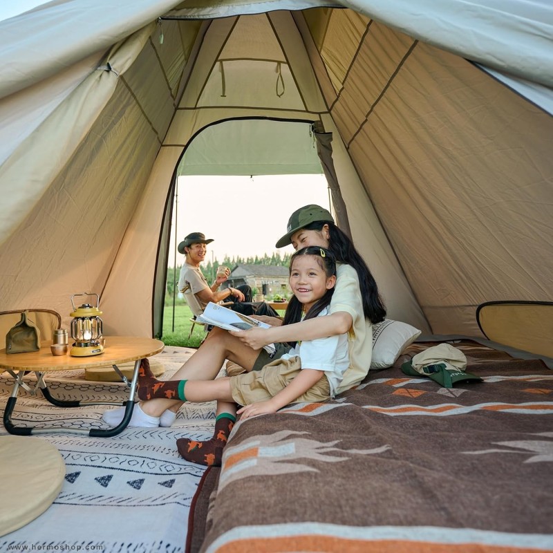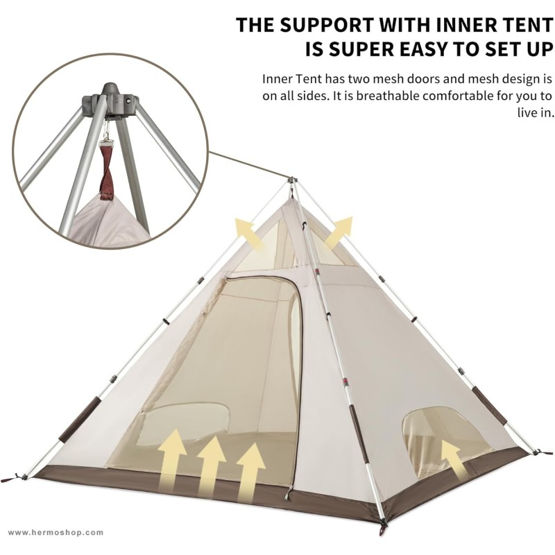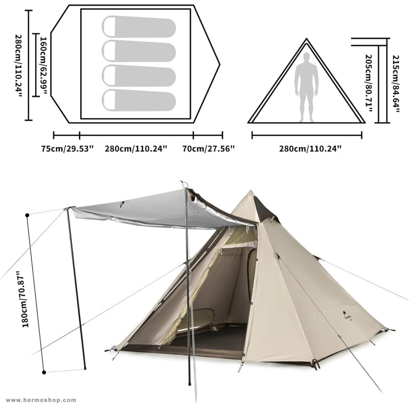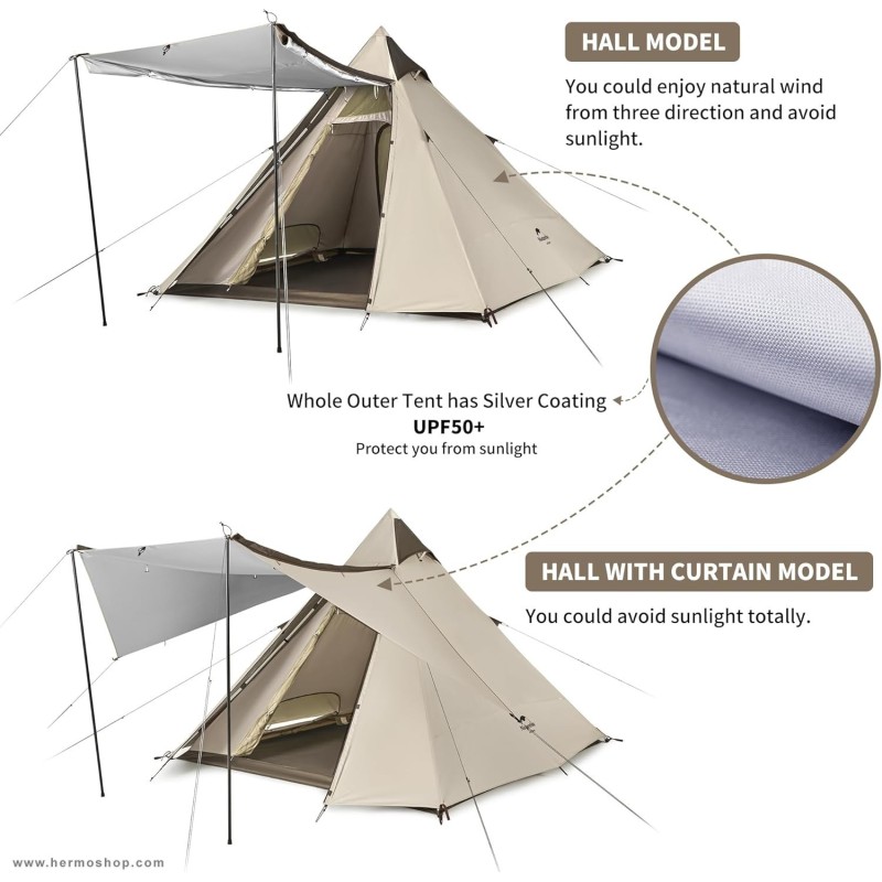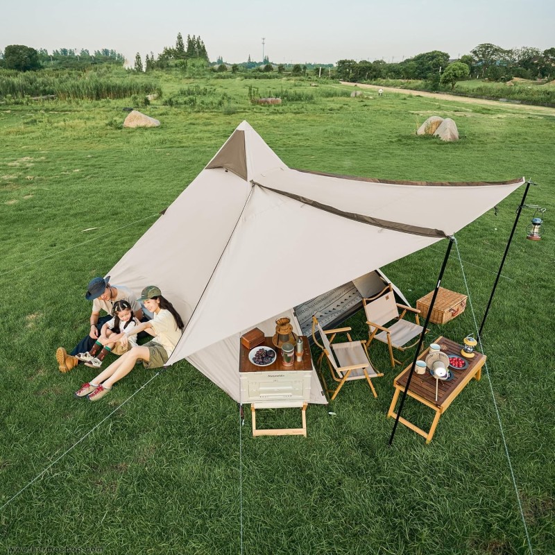 این چادر با ساختار هرمی چهاروجهی و بدنه مقاوم ساخته شده که پایداری استثنایی در برابر بادهای شدید ارائه میدهد. پارچه بیرونی با روکش نقرهای، انعکاس نور خورشید و مقاومت در برابر UV را تضمین میکند.