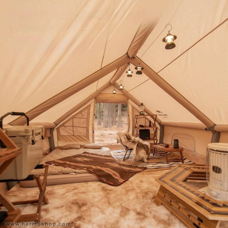 این چادر با ترکیب مواد کتان/پلیاستر، TPU و PVC ساخته شده که دوام بالا و مقاومت در برابر آب و رطوبت را تضمین میکند. طراحی بادی یکپارچه، امکان برپایی سریع و بدون نیاز به میلههای فلزی را فراهم میکند.