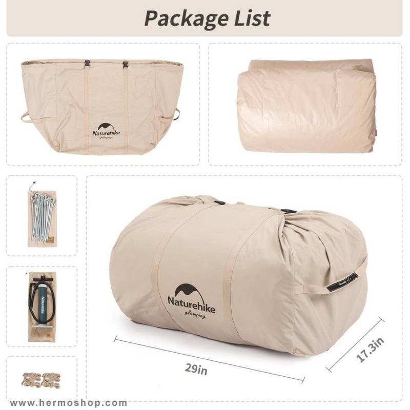 - اقلام: – چادر اصلی – پمپ باد مخصوص – 6 عدد طناب مهاربندی – 22 عدد میخ زمین – کیف حمل و نگهداری
