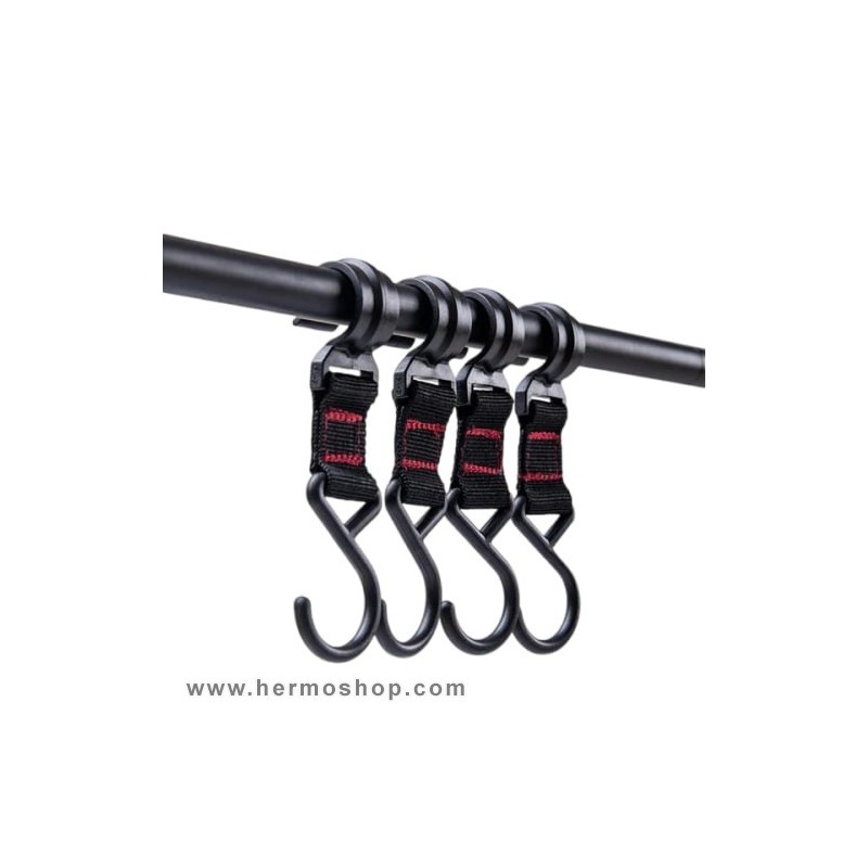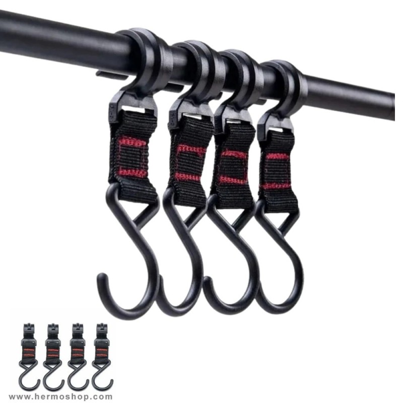 قلاب این محصول با طراحی S-shaped ساخته شده که دهانه باز برای نصب آسان و دهانه بسته برای جلوگیری از افتادن تصادفی وسایل را فراهم میآورد. بند پلیاستری با بافت متراکم، حتی در شرایط مرطوب دچار کشیدگی یا شلشدن نمیشود. اتصال محکم به میلهها با اصطکاک کنترلشده، از سرخوردن جلوگیری میکند.