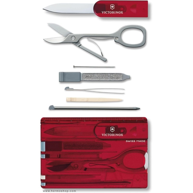 دارای: تیغه کوچک، قیچی، سوهان ناخن، پیچ گوشتی ۲.۵ میلی متری، خط کش (سانتی متر)، خط کش (اینچ)، سنجاق، موچین، خلال دندان، خودکار فشاری