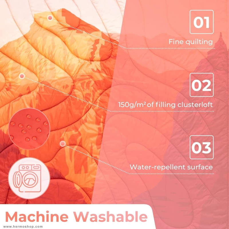 این محصول از پارچه پلیاستر 20D با دوام و الیاف پلیاستر عایق ساخته شده که تعادل مناسبی بین گرمایش و وزن سبک ایجاد میکند. طراحی با دکمههای محیطی امکان تبدیل به کیسه خواب را فراهم میکند.