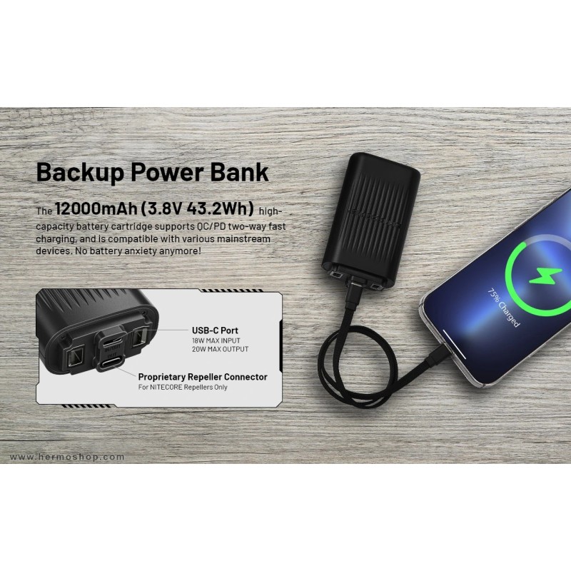 - باتری ۱۲۰۰۰ میلیآمپری قابل تعویض + پاوربانک QC/PD
