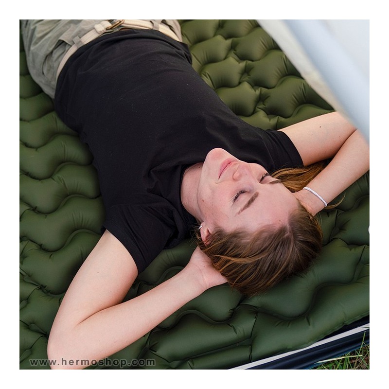 این زیرانداز با محفظههای بادی M-shaped طراحی شده که توزیع یکنواخت وزن و جلوگیری از افتادگی مرکزی را تضمین میکند. بالش متصل با ارتفاع ۱۴ سانتیمتر و سوپاپ مستقل، راحتی کامل سر و گردن را فراهم میآورد. پمپ پایی داخلی یکپارچه، امکان باد کردن بدون ابزار جانبی را ممکن میسازد.