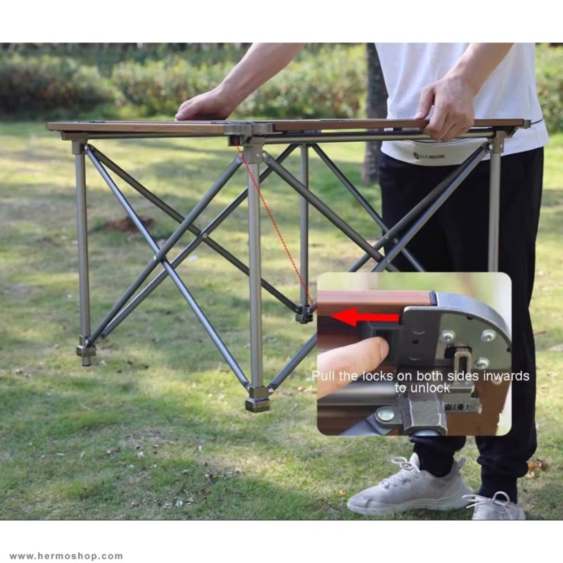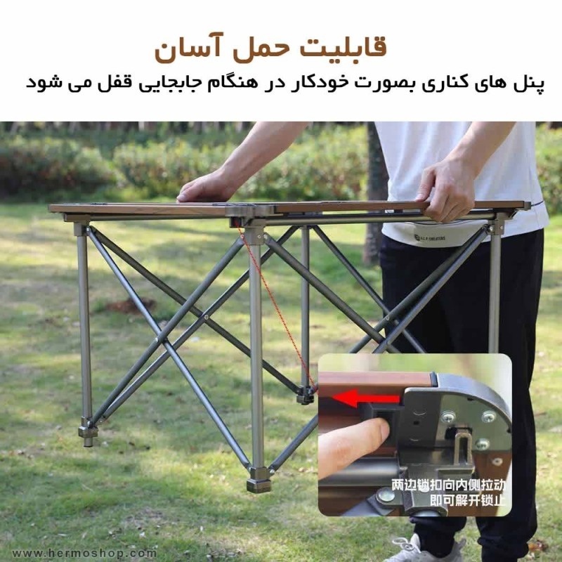 این میز از آلومینیوم سبک با طرح سطح چوبی ساخته شده که استحکام و زیبایی را همزمان ارائه میدهد. پایههای با روکش پلاستیکی مقاوم، ثبات و دوام میز را در شرایط مختلف تضمین میکنند.