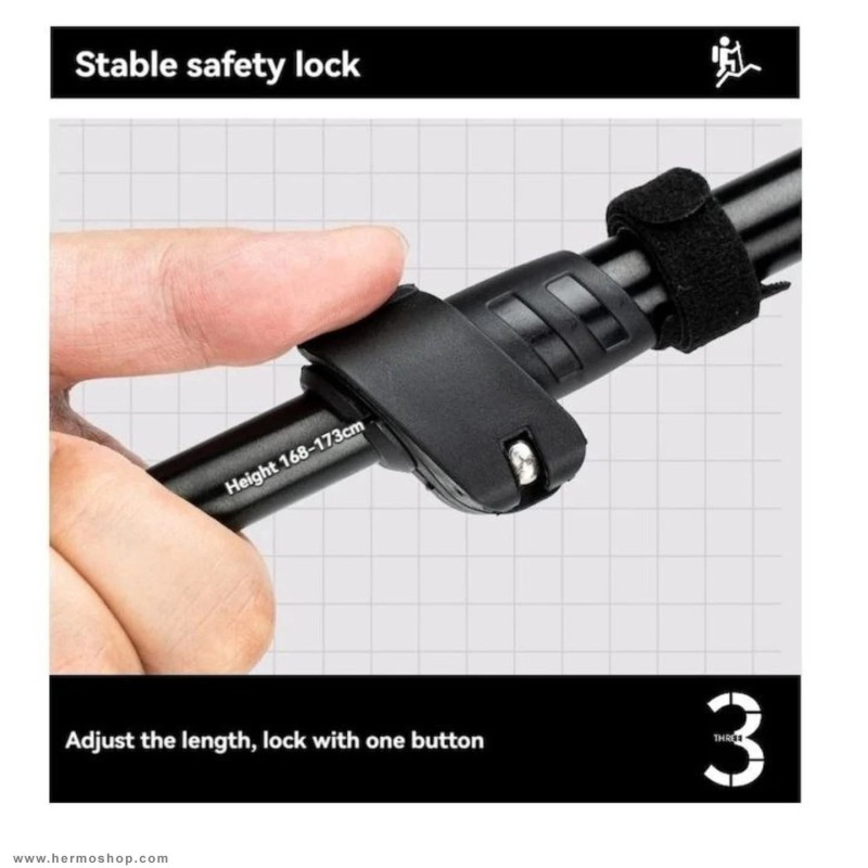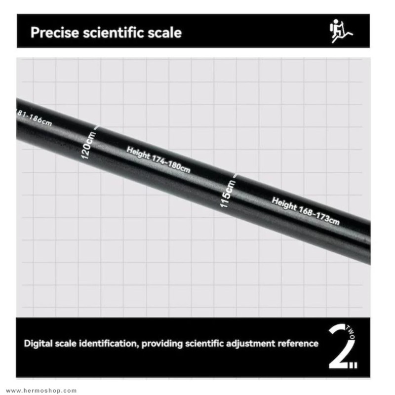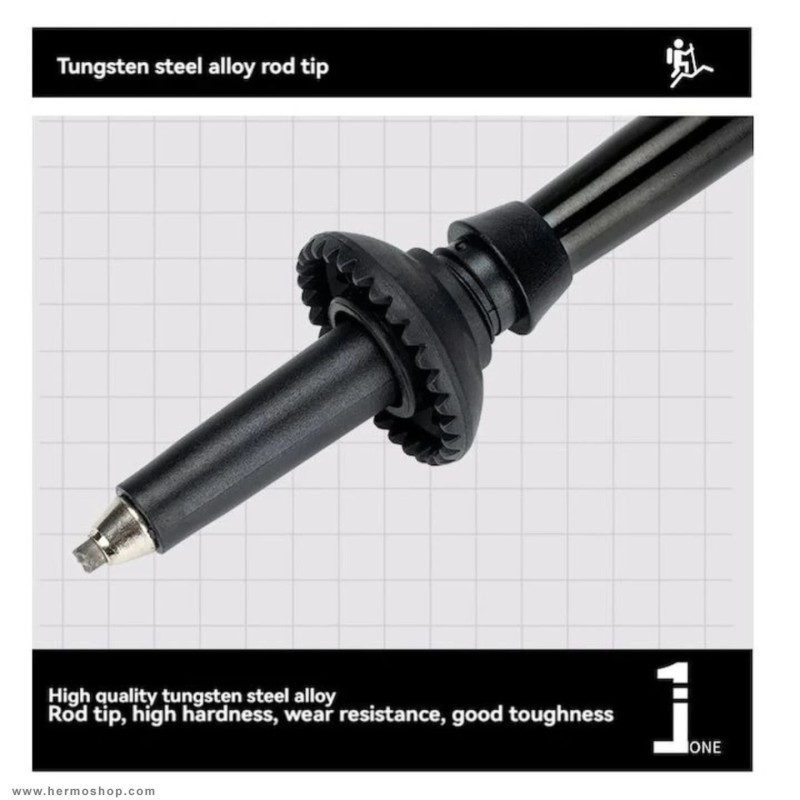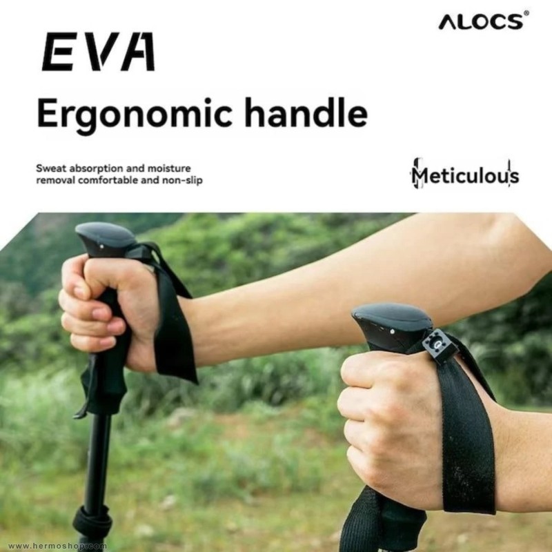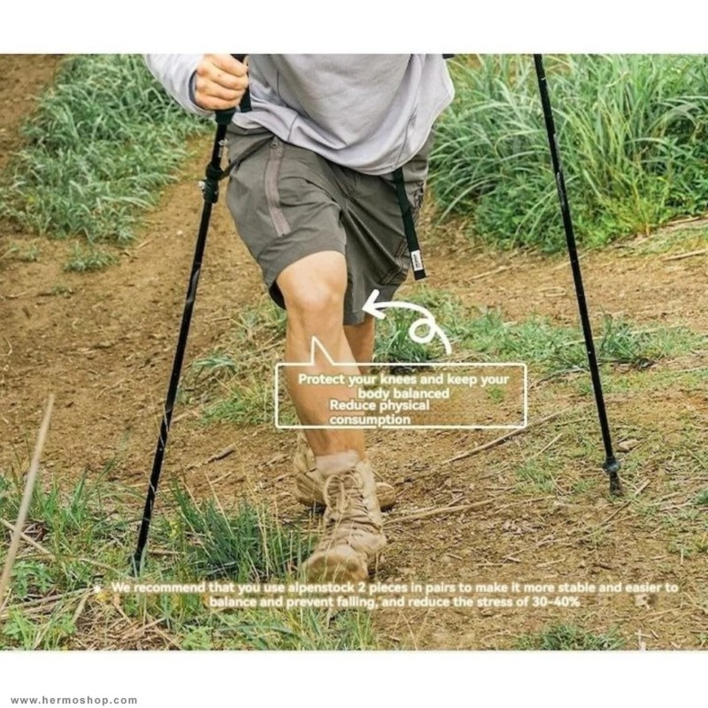این باتوم از آلیاژ آلومینیوم 7075 با استحکام بالا و وزن کم ساخته شده که تحمل فشارهای وارده در مسیرهای ناهموار را دارد. دسته آن از فوم EVA با بافت نرم و جاذب رطوبت پوشیده شده که امکان استفاده طولانیمدت را بدون ایجاد ناراحتی فراهم میکند. طراحی تاشو با مکانیزم کلیپسی، جمعوجور کردن و حمل باتوم را بسیار آسان مینماید.