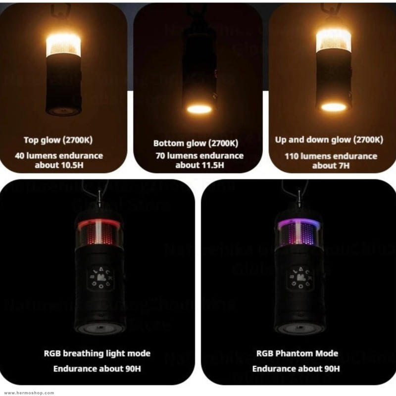 حالتهای چراغ اصلی: نور متمرکز (Spotlight) ، نور محیطی (Ambient) ، نور اصلی بالا (High Light 110lm) ، نور اصلی پایین (Low Light 70lm) ، نور RGB (فانتوم / تنفس)