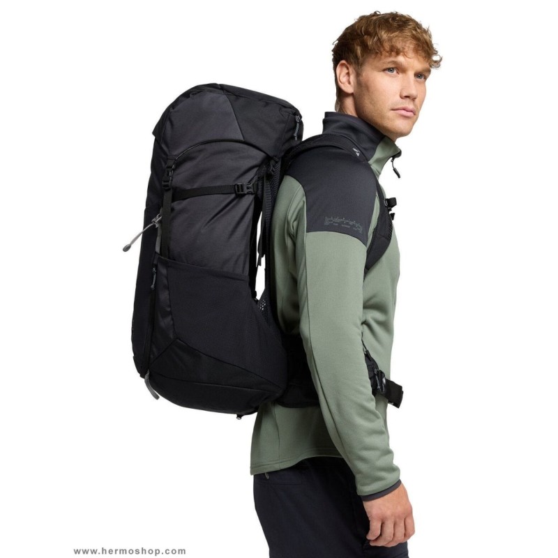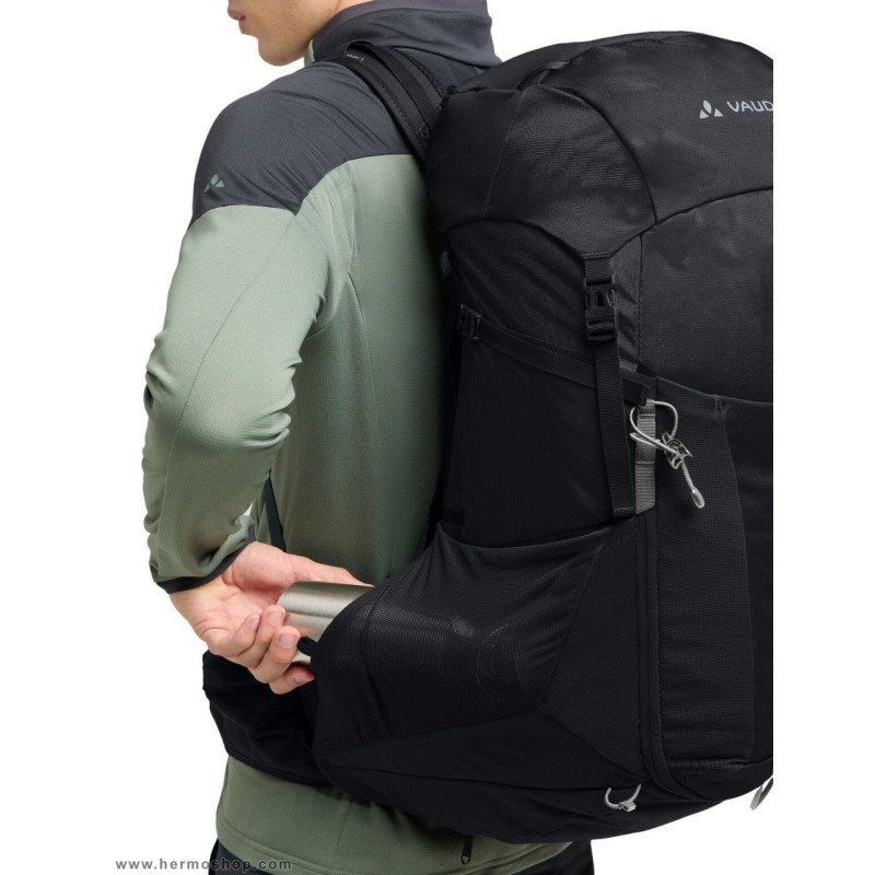 جیب های استرچ کناری؛ با قابلیت جا سازی بطری آب در حین صعود؛ و محل جا گذاری هلمت (کلاه کاسک) و لوازم ضروری و پوشاک دَم دستی در قسمت جلویی کوله