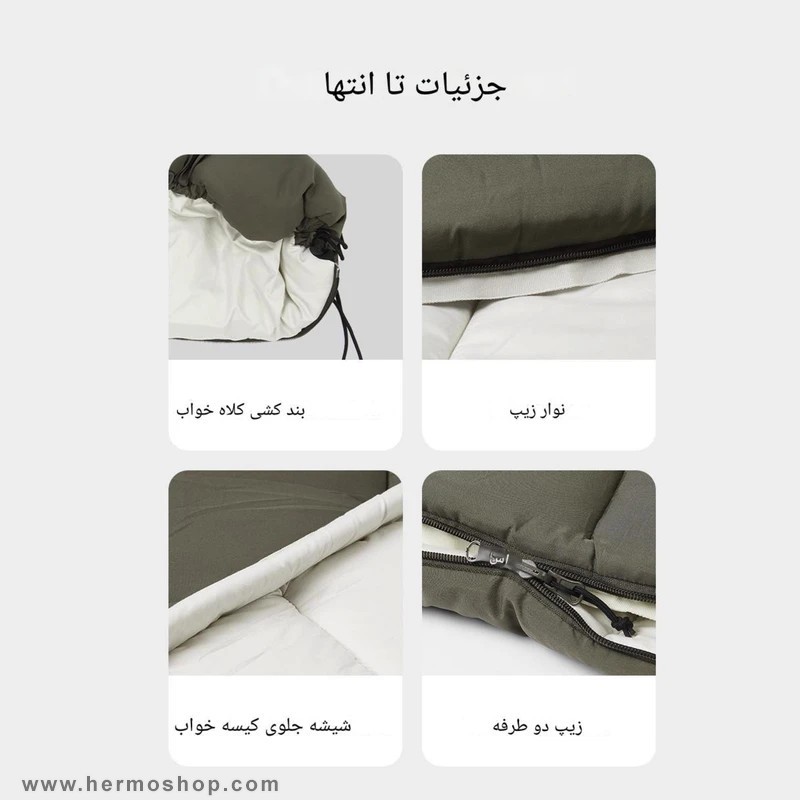- ساختار: کیسه خواب پاکتی با هود تنظیمشونده