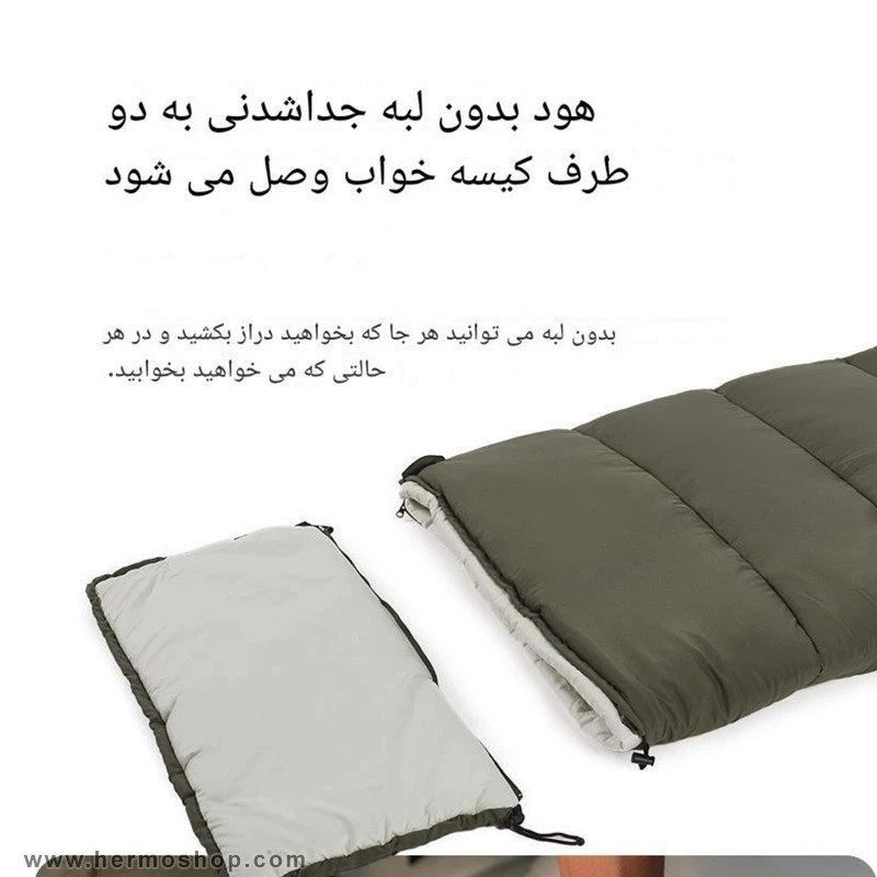 - ساختار: کیسه خواب پاکتی با هود تنظیمشونده