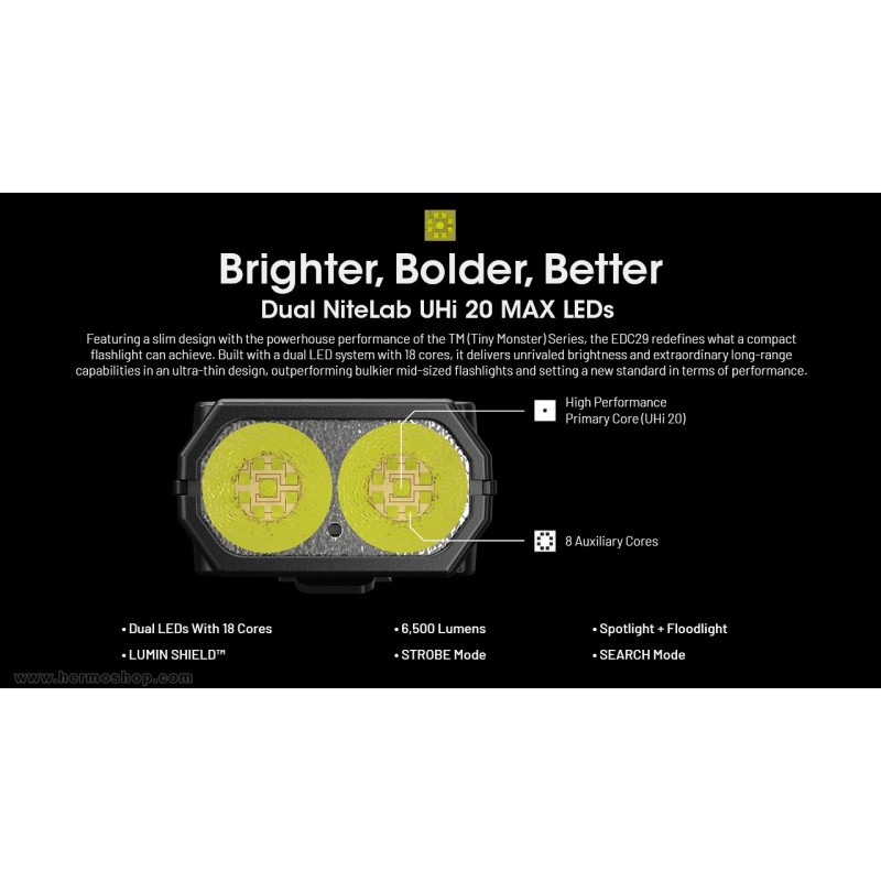 چراغ قوه نایتکر EDC29 قویترین چراغ قوه تاکتیکی فوقنازک تاکنون است که با روشنایی خیرهکننده ۶۵۰۰ لومن و برد پرتاب نور ۴۰۰ متر، استاندارد جدیدی در دسته EDC (Everyday Carry) و چراغهای قوه کامپکت تاکتیکال تعریف میکند. این مدل با طراحی باریک و ارگونومیک الهامگرفته از سری TM (Tiny Monster)، عملکردی فراتر از بسیاری چراغهای بزرگتر ارائه میدهد و برای حمل روزانه، استفاده تاکتیکی، کمپینگ، جستجو، عملیات نجات و شرایط اضطراری ایدهآل است.