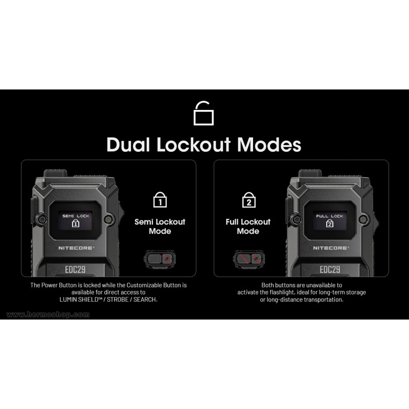 - LUMIN SHIELD™ / STROBE: فشار کامل و نگهداشتن دکمه قابل تنظیم (تغییر با فشار دکمه پاور)