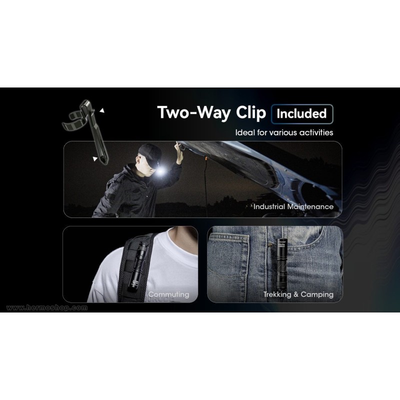 - گیره دوطرفه → حمل آسان روی جیب، کمربند یا کلاه